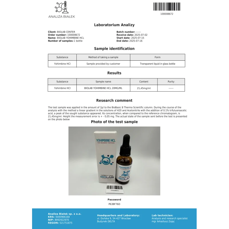 In the tested sample BIOLAB YOHIMBINE HCL 30 ml, the presence of Yohimbine HCl was confirmed at a level of 21.45 mg/ml. The analysis was performed using a chromatographic method, the declared measurement error is ±0.05 mg, while the report did not indicate the purity level of the tested substance.