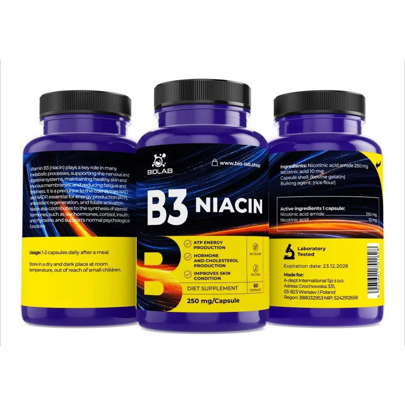 Vitamin B3, also known as vitamin PP, is a precursor for the production of the body's "longevity molecule" – NAD+. This is a key element of metabolic processes occurring in every cell of your body. Our complex combines two active forms: nicotinamide and nicotinic acid, providing optimal support for energy production, skin health, and nervous system stability.